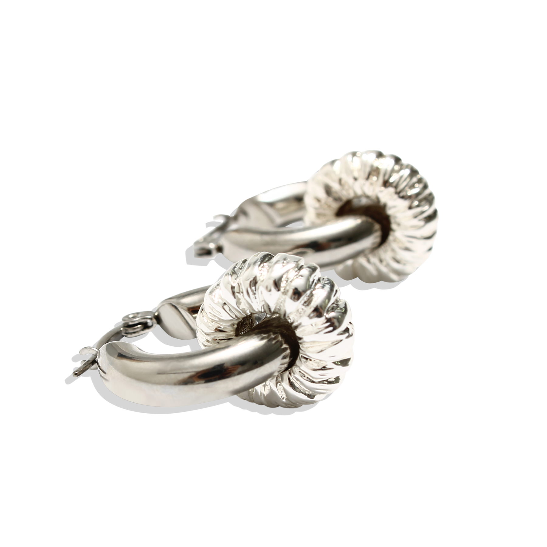 Sleek and contemporary. These chunky hoops are plated in sterling silver and paired with silver-plated textured donut bead for a tonal, sculptural finish. A versatile piece that works from day to night.