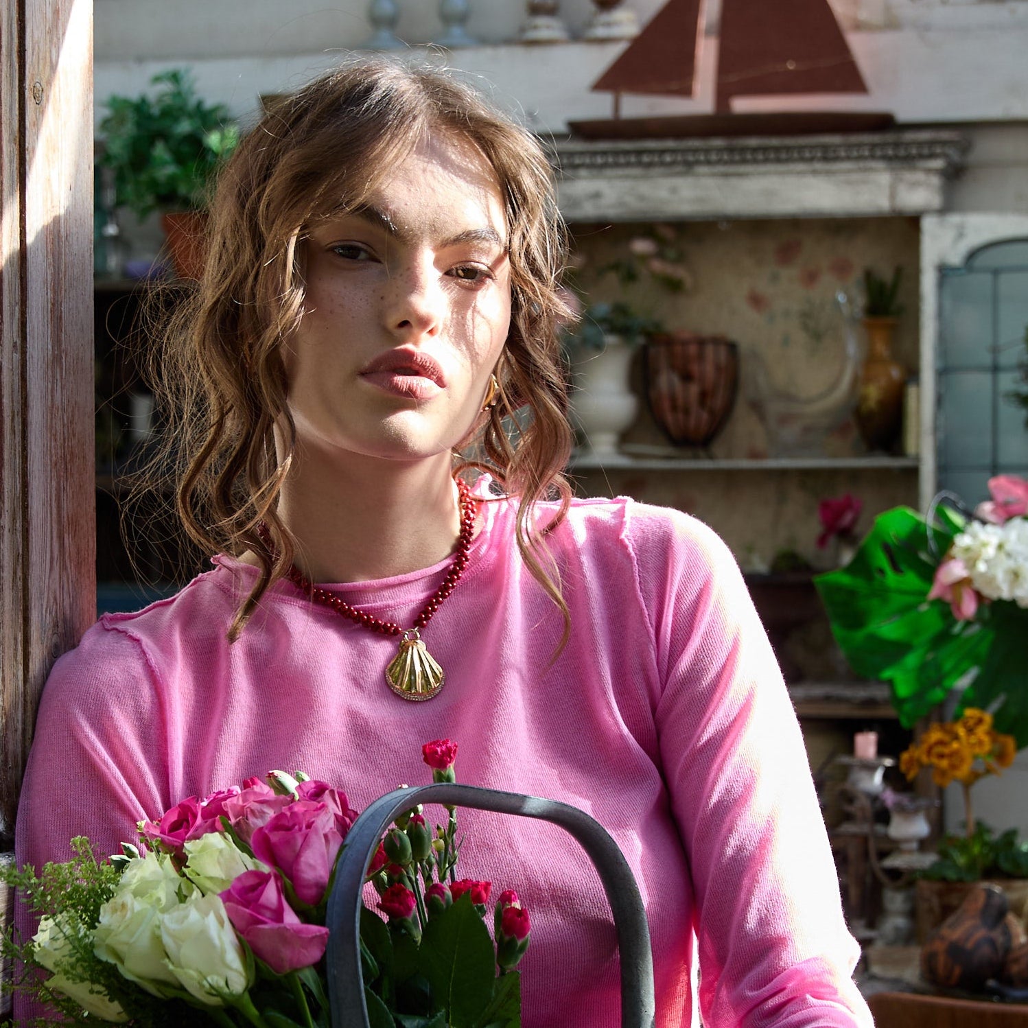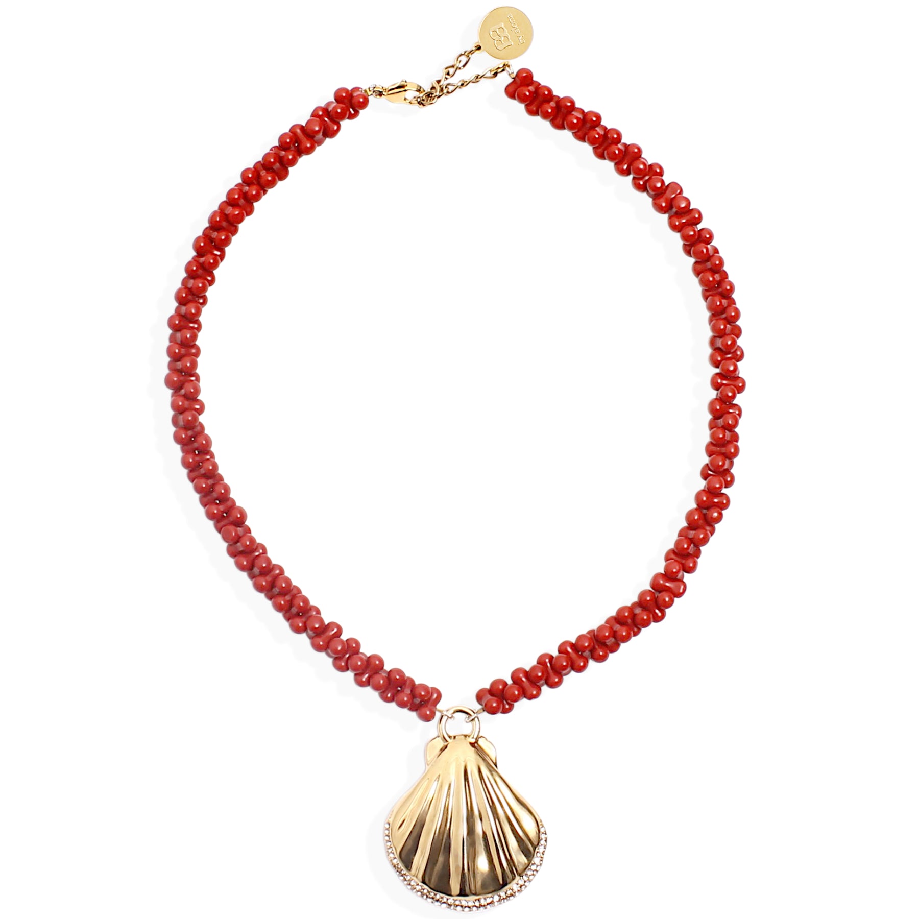 Bold colour, sculptural shine. The Jerry Necklace features hand-strung red bone-shaped beads, finished with our 18k gold-plated Gila shell pendant accented with cubic zirconia stones. Vibrant and striking, it’s a piece designed to bring energy and character to your everyday look.