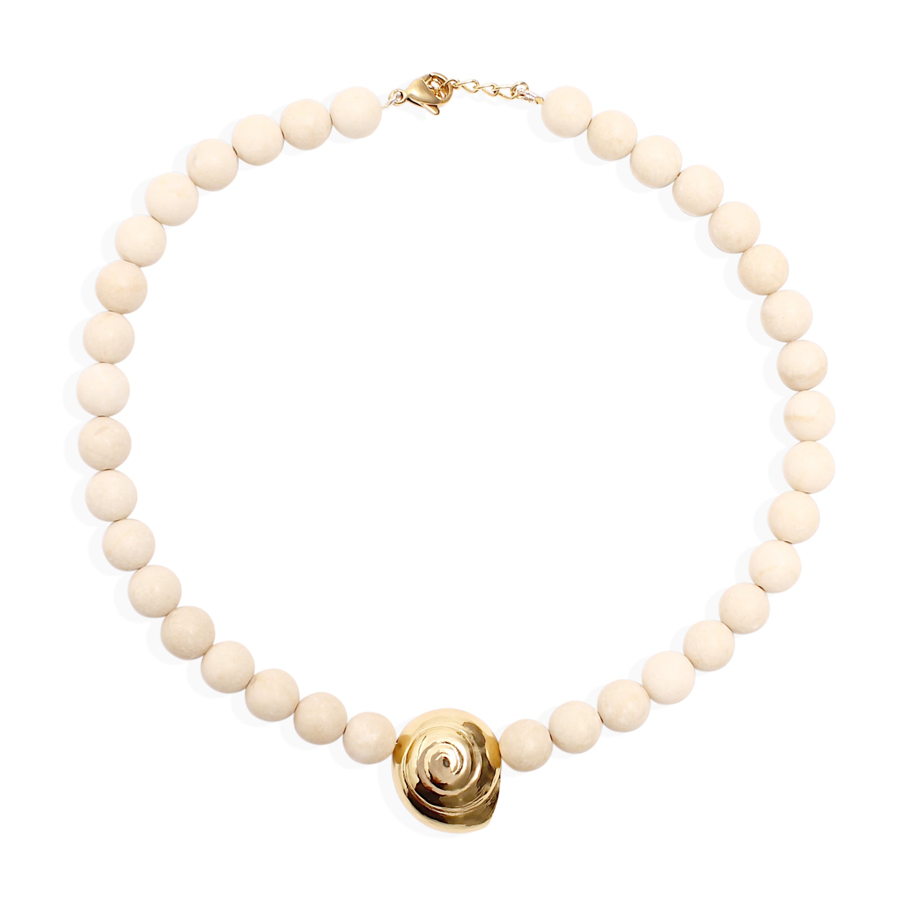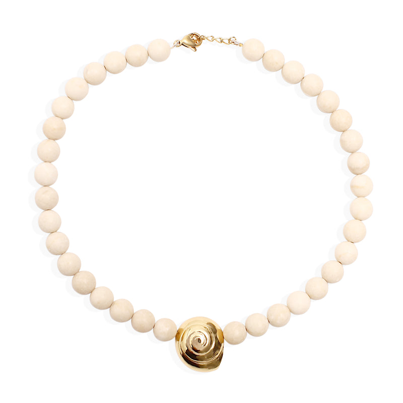 Soft texture meets sculptural shine. The Sybill necklace pairs matte beads with an 18k gold-plated swirl pendant, inspired by organic fossil forms. Earthy yet polished, it’s a piece that feels collected, considered, and quietly striking.