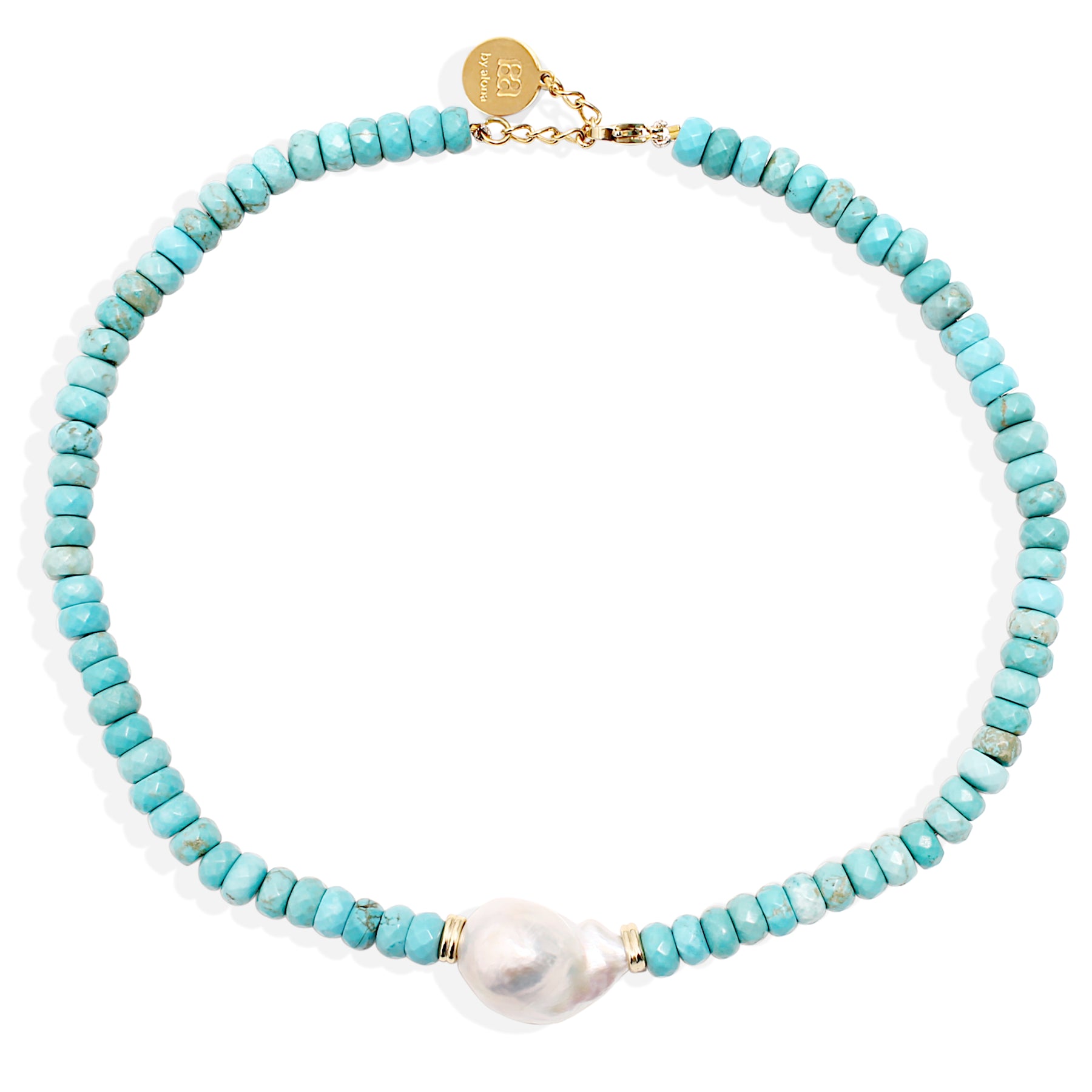 Fresh colour, soft glow. The Iman necklace features hand-strung turquoise beads, finished with a luminous baroque pearl. Organic texture meets natural iridescence in a piece that feels easy, considered, and quietly striking.