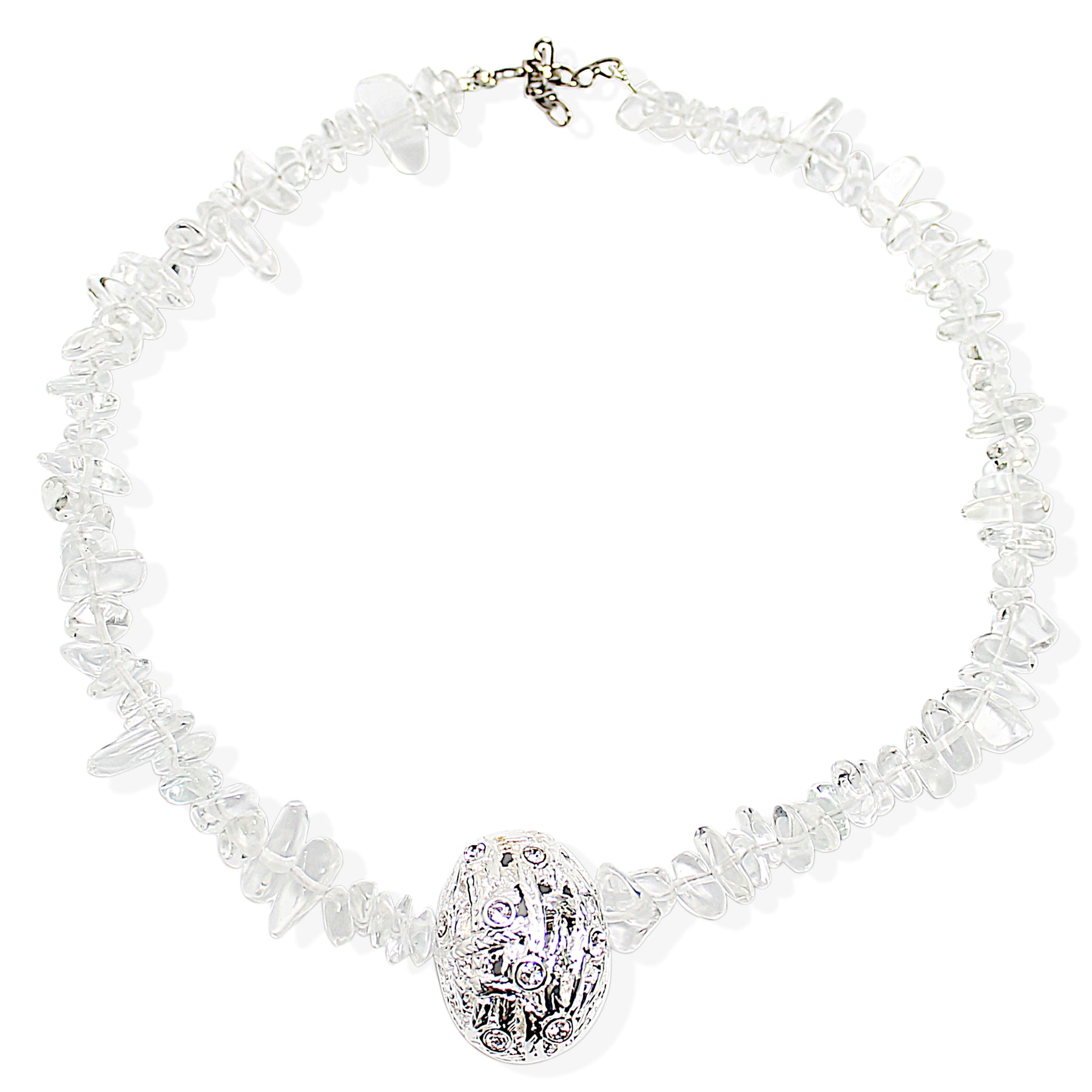 A modern twist on timeless elegance. This necklace features our braided sterling silver plated pendant, handset with sparkling cubic zirconia stones, paired with a strand of clear quartz beads