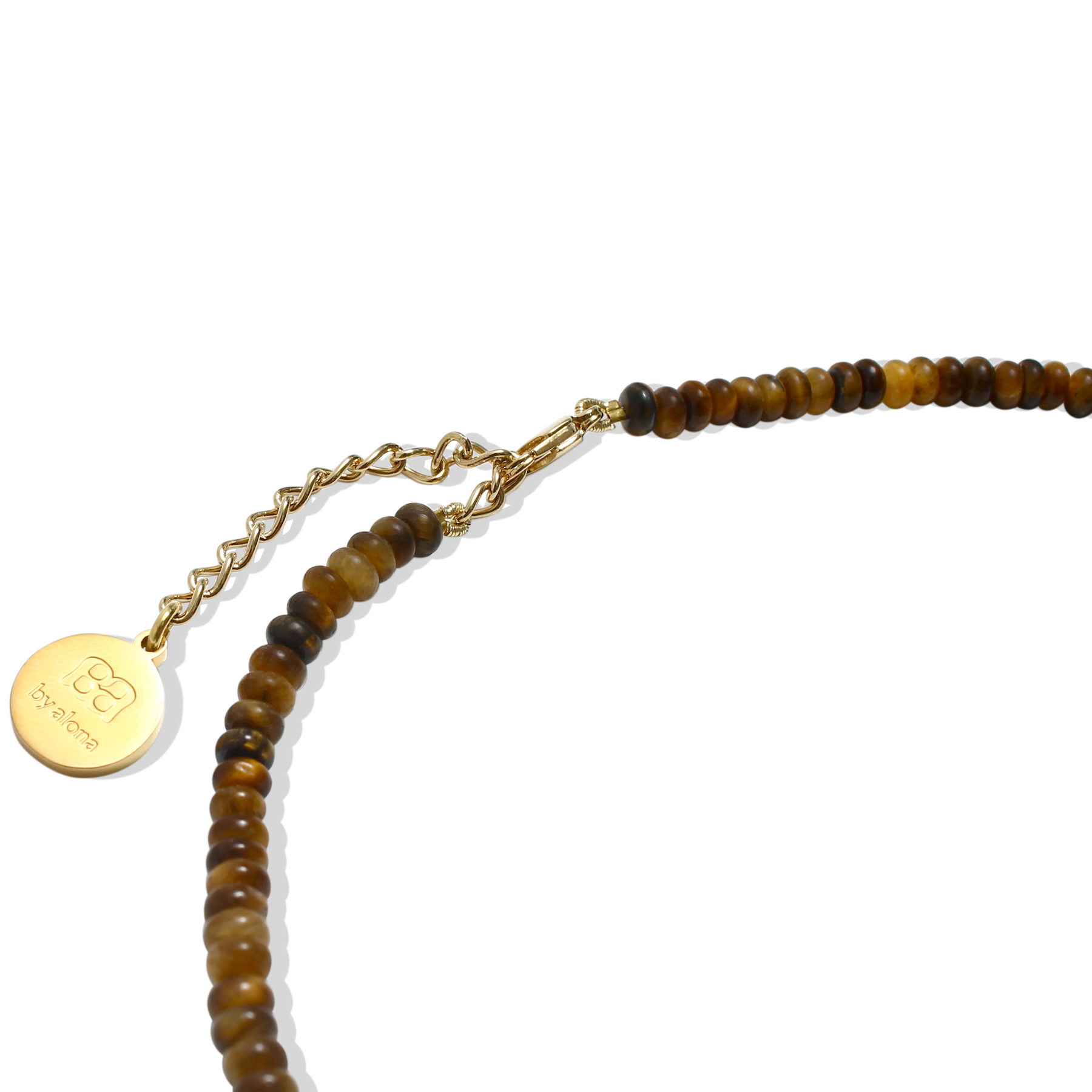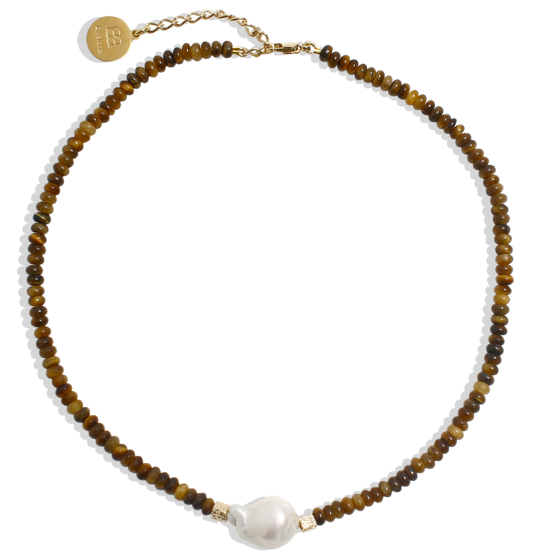Hand-strung design features polished tiger’s eye button beads, accented with 18kt gold-plated cube beads and finished with a lustrous baroque pearl at the center. A bold piece that brings natural texture and timeless sophistication together.