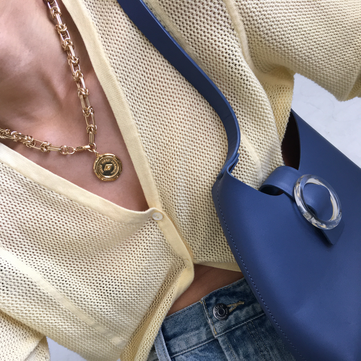 Our timeless Sydney Necklace is made from 18k gold plated knot style chain and finished with a textured pendant with our signature 'what goes around' karma coin, making it a unique and meaningful accessory. The vintage-style chunky necklace makes a stunning statement. It has a front closure so can be worn as a Lariat style necklace.