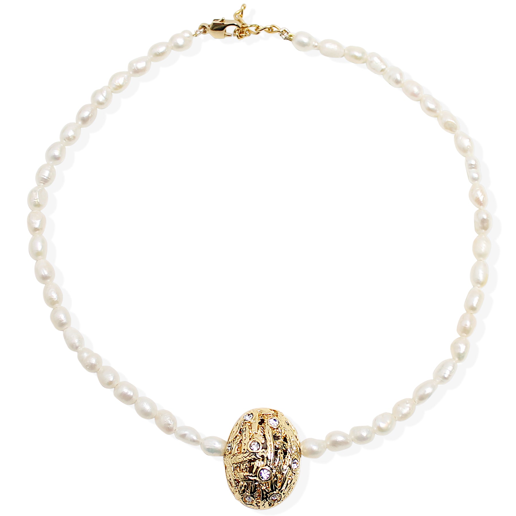 A modern twist on timeless elegance. This necklace features our braided 18kt gold plated pendant, handset with sparkling cubic zirconia stones, paired with a strand of natural rice pearls.